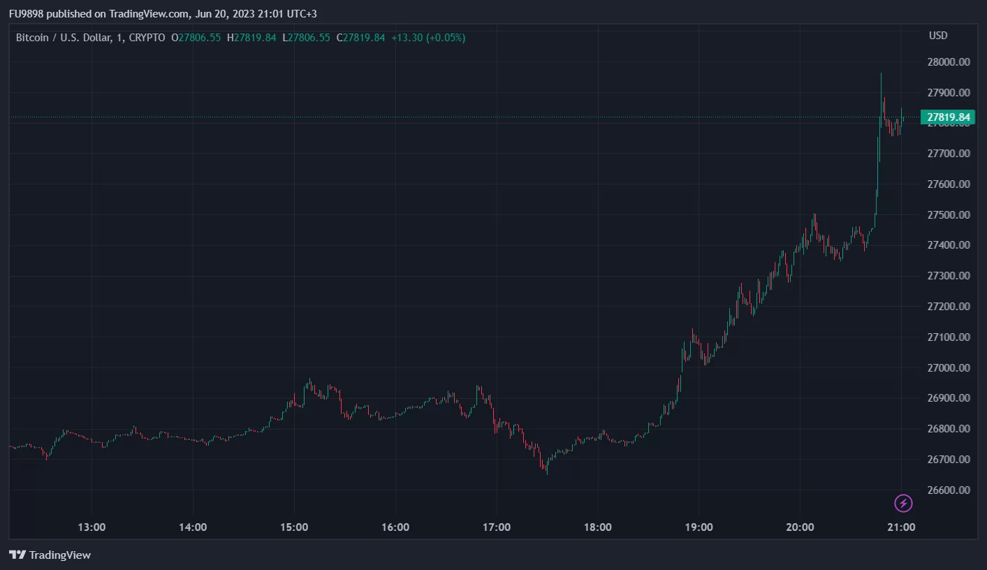 Gün içerisinde 26.500 dolar seviyesi civarında seyreden Bitcoin fiyatı, ani bir hareket ile 28.000 dolar sınırına dayandı.