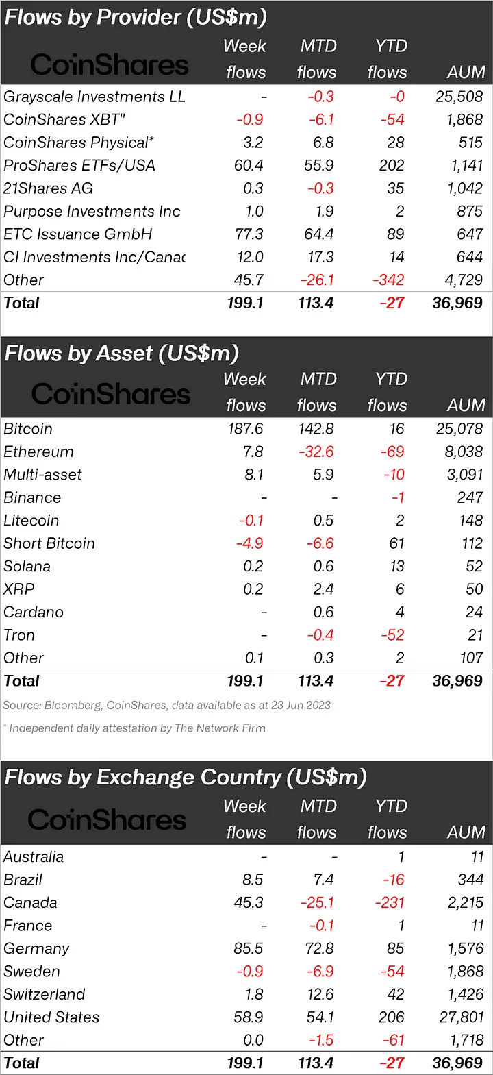 ABD’deki spot Bitcoin ETF başvurularının kurumsal kripto para fonlarına olumlu yansıdığını belirten CoinShares, geçtiğimiz hafta 199 milyon dolarlık giriş yaşandığını açıkladı.