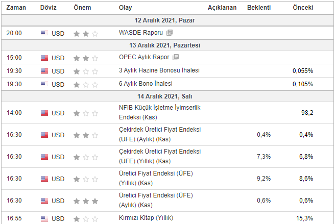 Bu veriler arasında kritik bir FED toplantısı da yapılacak. 15 Aralık Çarşamba günü TSI ile 22.00’da ABD para politikası kurulunun yılın son kararlarını açıklaması bekleniyor. Kasım ayı itibariye varlık alımlarını azaltmaya başlayan FED’in son enflasyon verileri sonrası şahin mi, güvercin mi olduğu takip edilecek.