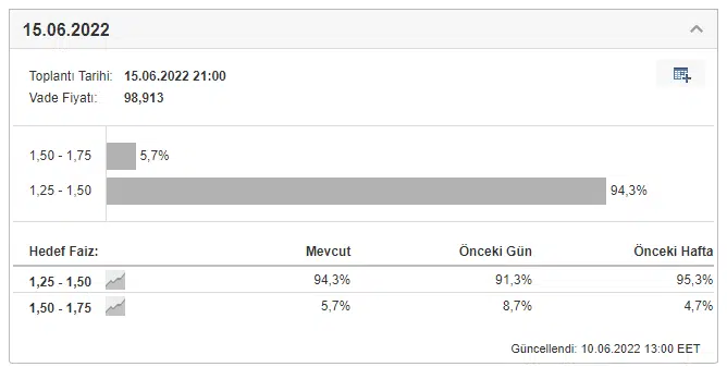 Investing anketine katılan yatırımcıların %94,3’ü 15 Haziran’daki FED toplantısında 50 baz puanlık faiz artışı beklediğini ifade ediyor.