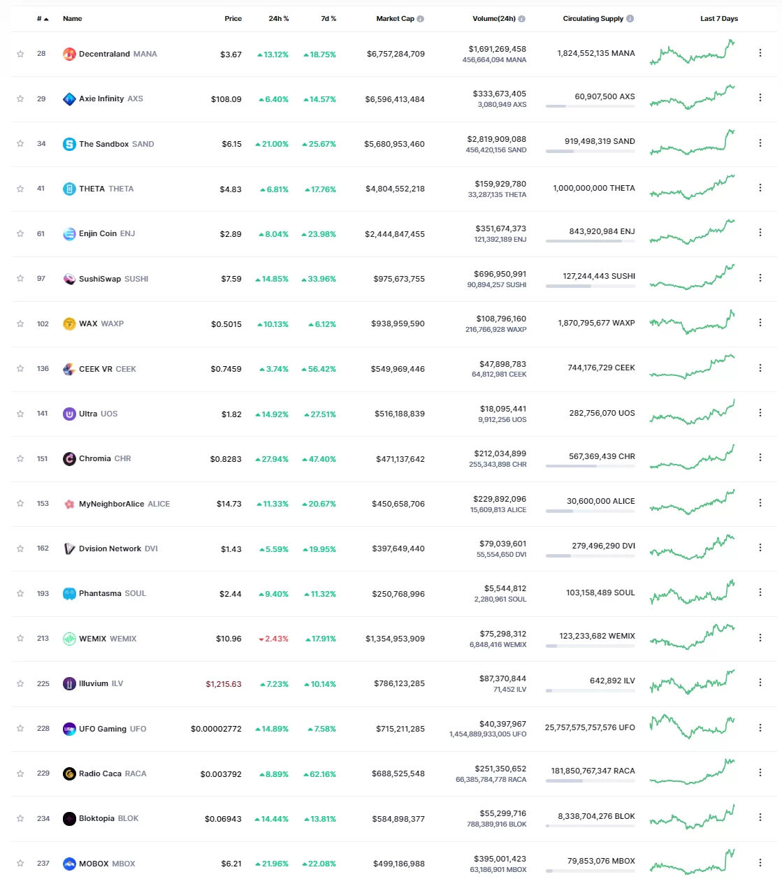 Ayrıntılara baktığımızda piyasa değeri bakımından en değerli metaverse odaklı kripto paralar tarafında MANA, AXS ve SAND olduğunu gözlemliyoruz. Bu kripto paralardaki sıçrayışlar %20’lere ulaşırken, metaverse tablosunda yeşil rengin baskın olduğunu görüyoruz.