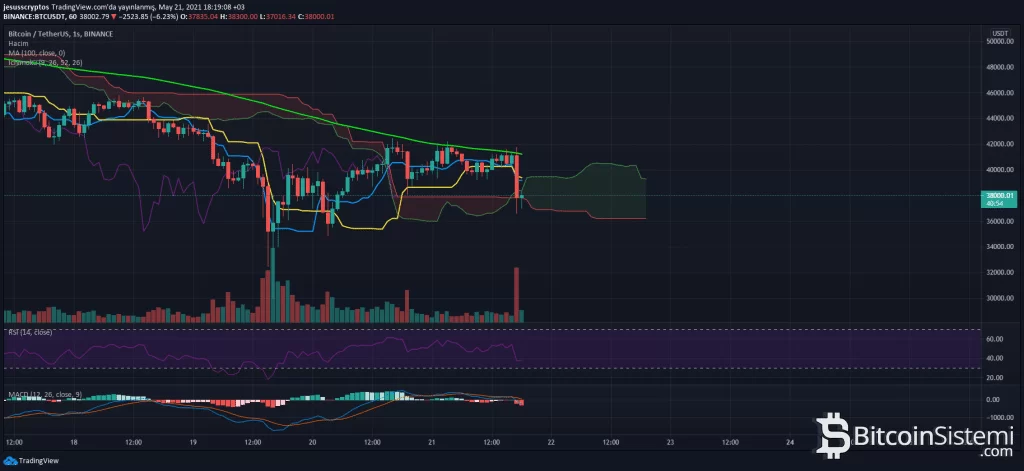 Saatlik grafikte de oldukça önemli bir seviye olan ve MA100’e denk gelen 42.000 dolar civarından hızla düşen BTC, şimdilik Ichimoku bulutuna tutunmuşa benziyor. Bitcoin’de son günlerde gelen FUD haberleri, o anda BTC’yi kötü etkilese de piyasada BTC’ye karşı bir ilginin hâlen olduğu ve fiyatın sonrasında yükselmeye devam ettiği görülüyor. Yani bu FUD haberleri sürecinin bitmesiyle BTC’nin yeniden toparlanması bekleniyor.