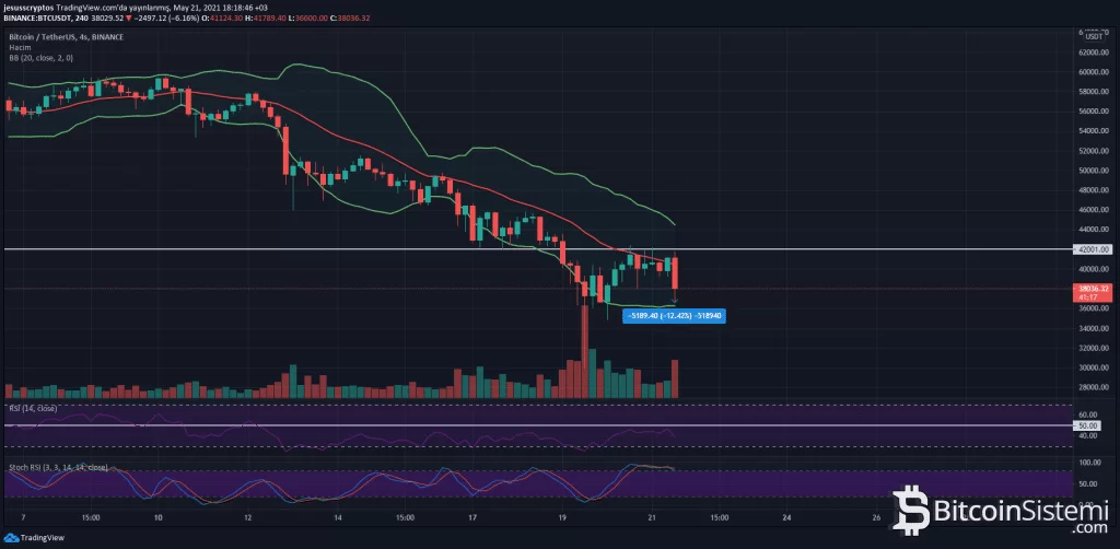 Bu açıklamalar sırasında 42.000 dolarlık önemli bir seviyeyi zorlayan BTC, hızla gelen satışlarla %12’lik bir düşüş yaşadı. Bu düşüşle birlikte 4 saatlik grafikte Bollinger Bantlarının alt bandı olan 36.600 dolara iğne atan BTC, yayın saati itibariyle 36.500 dolar üzerinden alıcı buluyor.