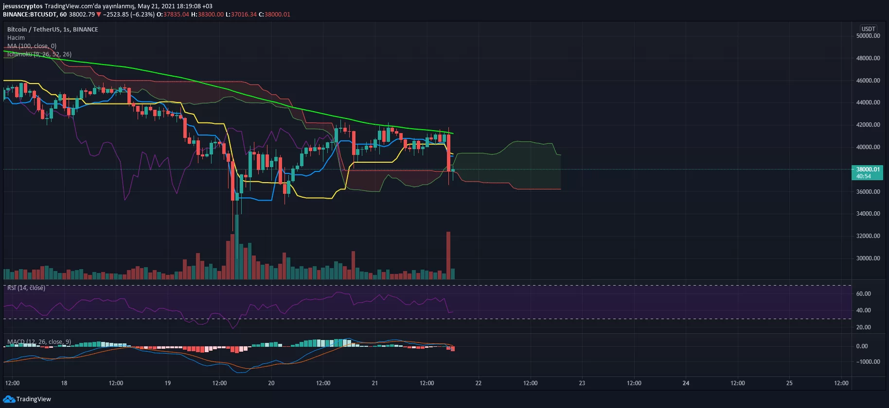 Saatlik grafikte de oldukça önemli bir seviye olan ve MA100’e denk gelen 42.000 dolar civarından hızla düşen BTC, şimdilik Ichimoku bulutuna tutunmuşa benziyor. Bitcoin’de son günlerde gelen FUD haberleri, o anda BTC’yi kötü etkilese de piyasada BTC’ye karşı bir ilginin hâlen olduğu ve fiyatın sonrasında yükselmeye devam ettiği görülüyor. Yani bu FUD haberleri sürecinin bitmesiyle BTC’nin yeniden toparlanması bekleniyor.