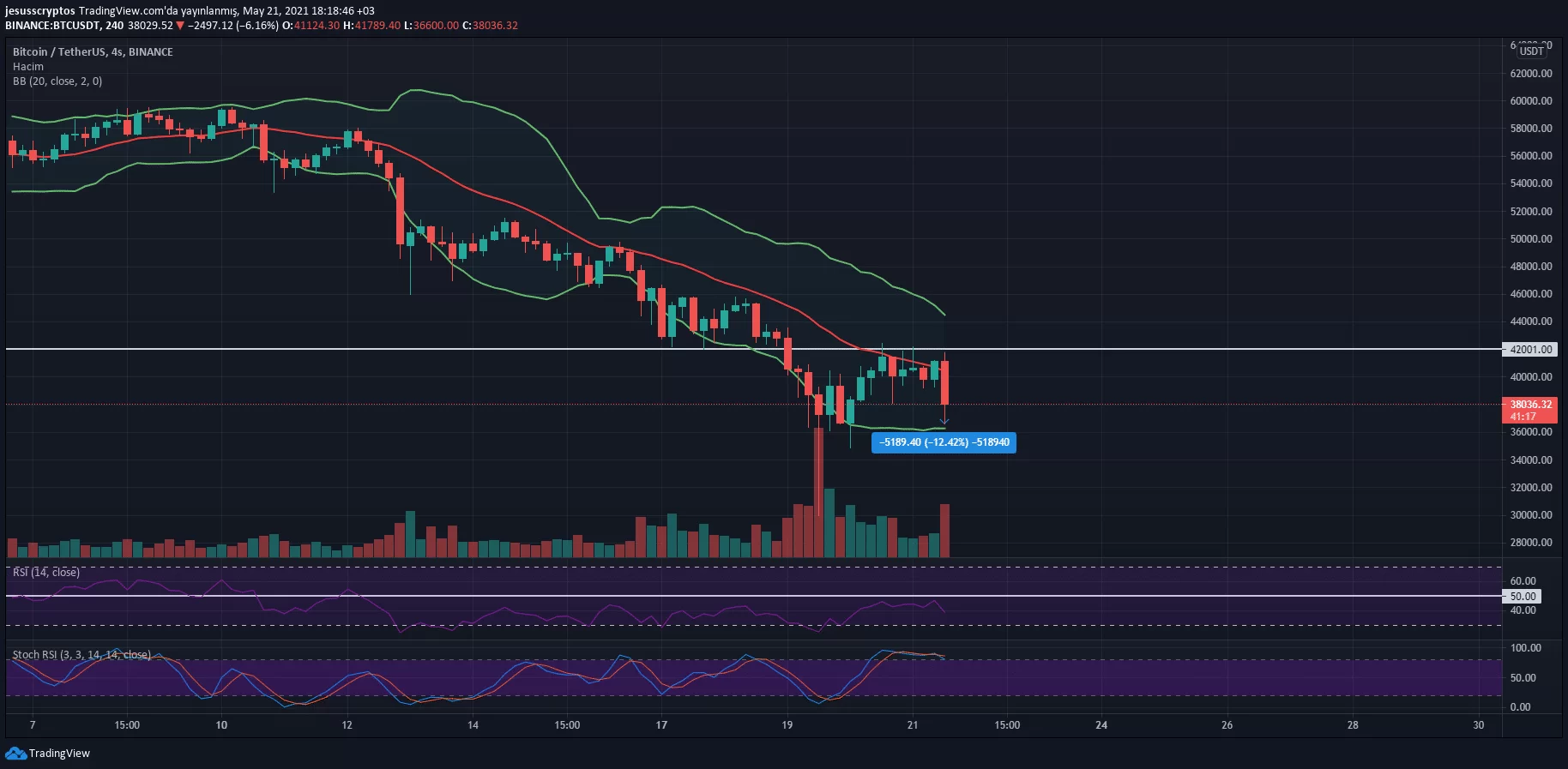 Bu açıklamalar sırasında 42.000 dolarlık önemli bir seviyeyi zorlayan BTC, hızla gelen satışlarla %12’lik bir düşüş yaşadı. Bu düşüşle birlikte 4 saatlik grafikte Bollinger Bantlarının alt bandı olan 36.600 dolara iğne atan BTC, yayın saati itibariyle 36.500 dolar üzerinden alıcı buluyor.