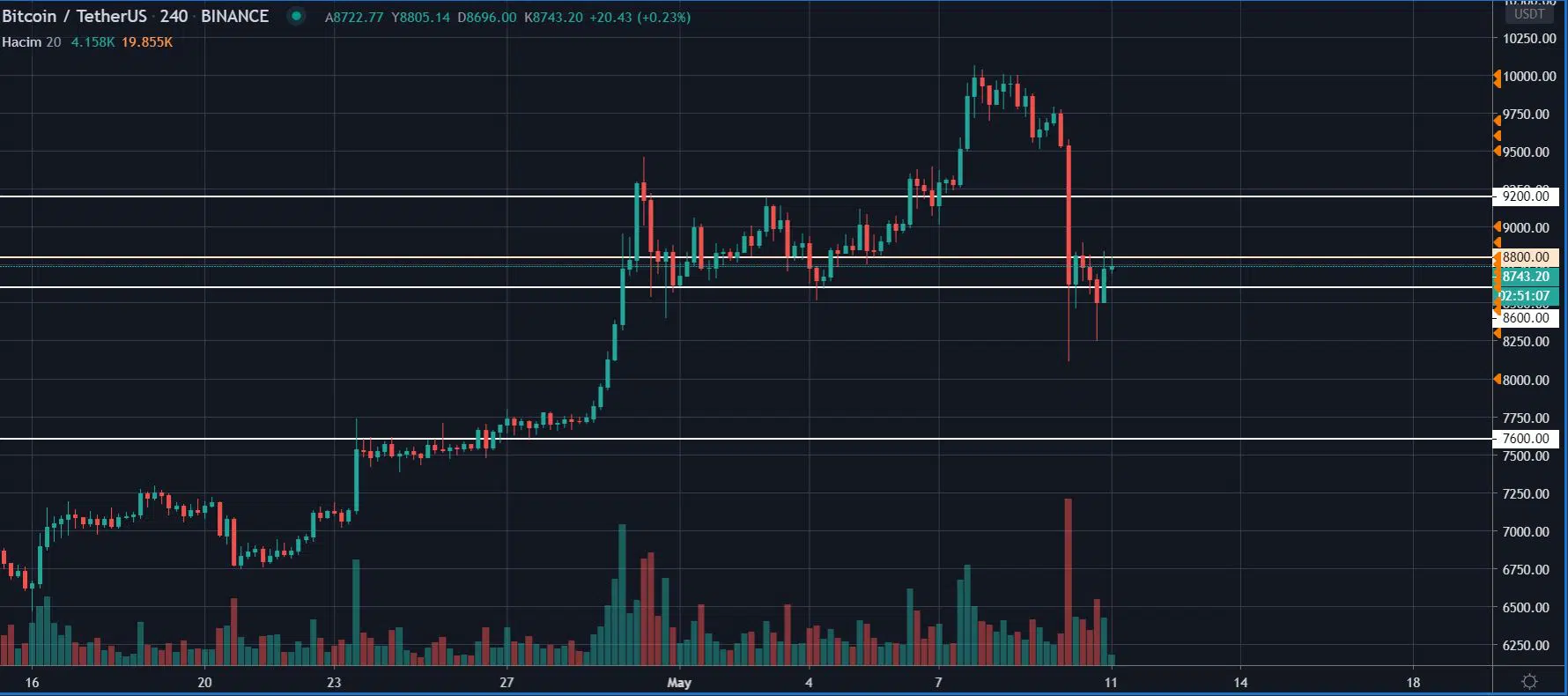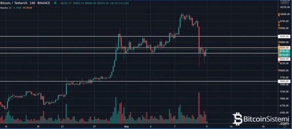 Güncel olarak 8800 ve 9200 dolar seviyeleri direnç noktası olarak karşımıza çıkarken, destek noktaları ise 8350, 8100 ve ana destek olarak ise 7600 dolar seviyeleri olarak karşımıza çıkıyor.