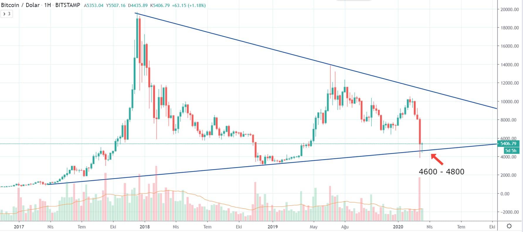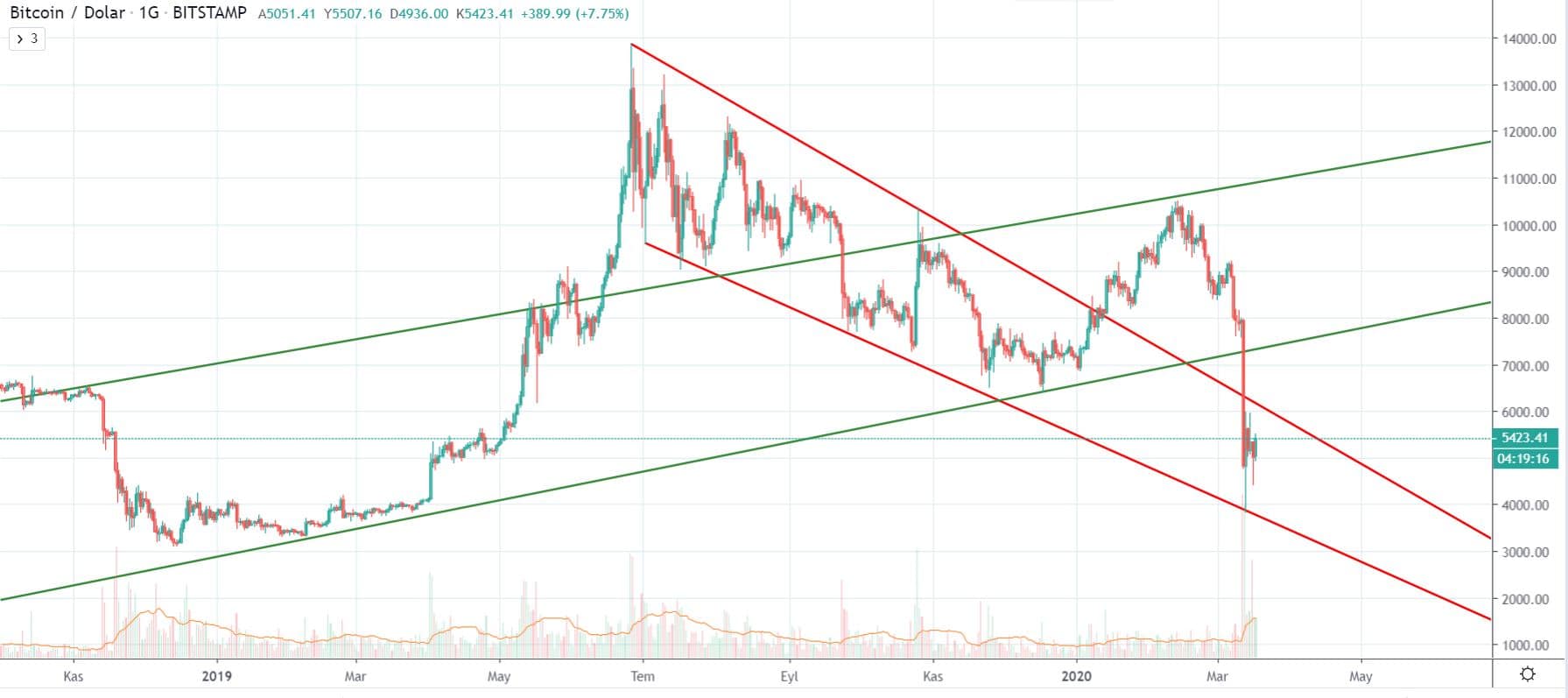 Bitcoin‘de halving olayı etkisi sebebiyle 10.000 dolar seviyelerinden beri düşüşlerin görülebilecek olduğunu ifade etmiştik. Bu baskıya bir de dünyadaki krizler eklenince fiyat hiç tahmin edilmeyen seviyelere kadar gerilemiş oldu. Ancak büyük resme bakıldığı zaman Bitcoin’in aslında her zaman kanal içerisinde hareket ettiği ve trend çizgileri içerisinde şekillendiği görülüyor.