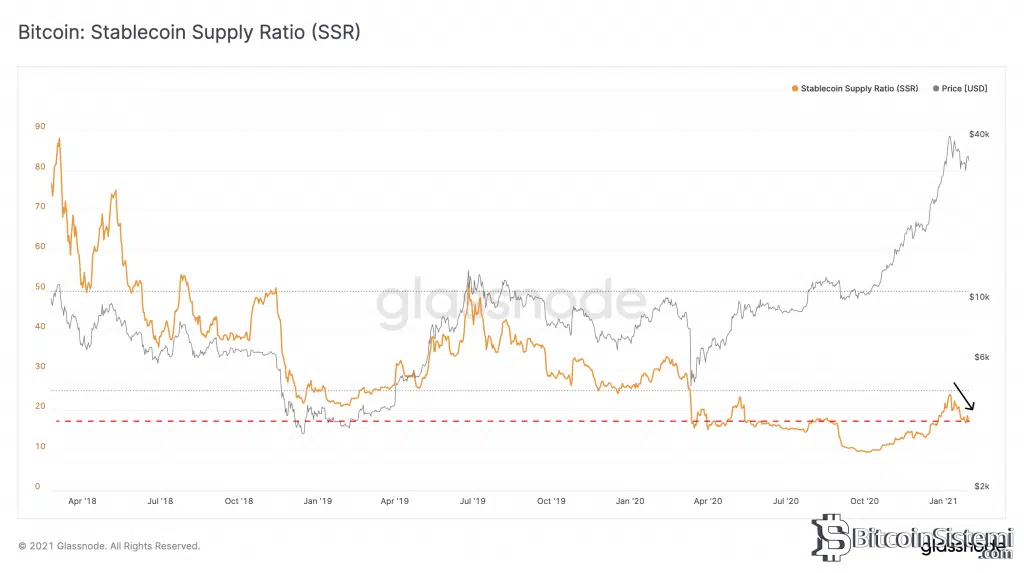 Analistin çıkarımlarının temellerini oluşturan indikatör SSR indikatörü olarak bilinen ” Stablecoin Supply Ratio” dur.