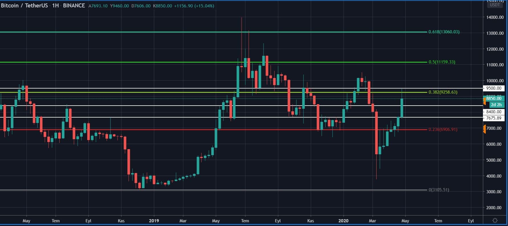 Haftalık grafiğe bakıldığı zaman 8400 dolar çok belirleyici olurken bu seviyenin altına düşülmesi durumunda 7600 dolar seviyelerinin görülebilmesi oldukça olası. Öte yandan 9500 dolar seviyesinin üzerine çıkılması durumunda da fiyat 10.600 dolar seviyelerine kadar sert bir şekilde ivmelenebilir. Bu sebeple bu seviyelere dikkat edilmesi oldukça önemli.