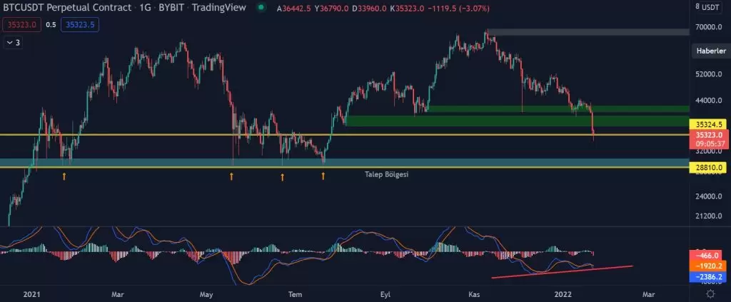 Son zamanlarda makro ekonomi tarafında yaşanan belirsizlikler nedeniyle, ABD endekslerinin düşüşü beraberinde gelen satış baskısı ile Bitcoin tarafında da etkiler görüldü. BTC 43.500 dolar seviyelerinden 33.900 dolar seviyelerine düzeltme yapmadan sert düştü.