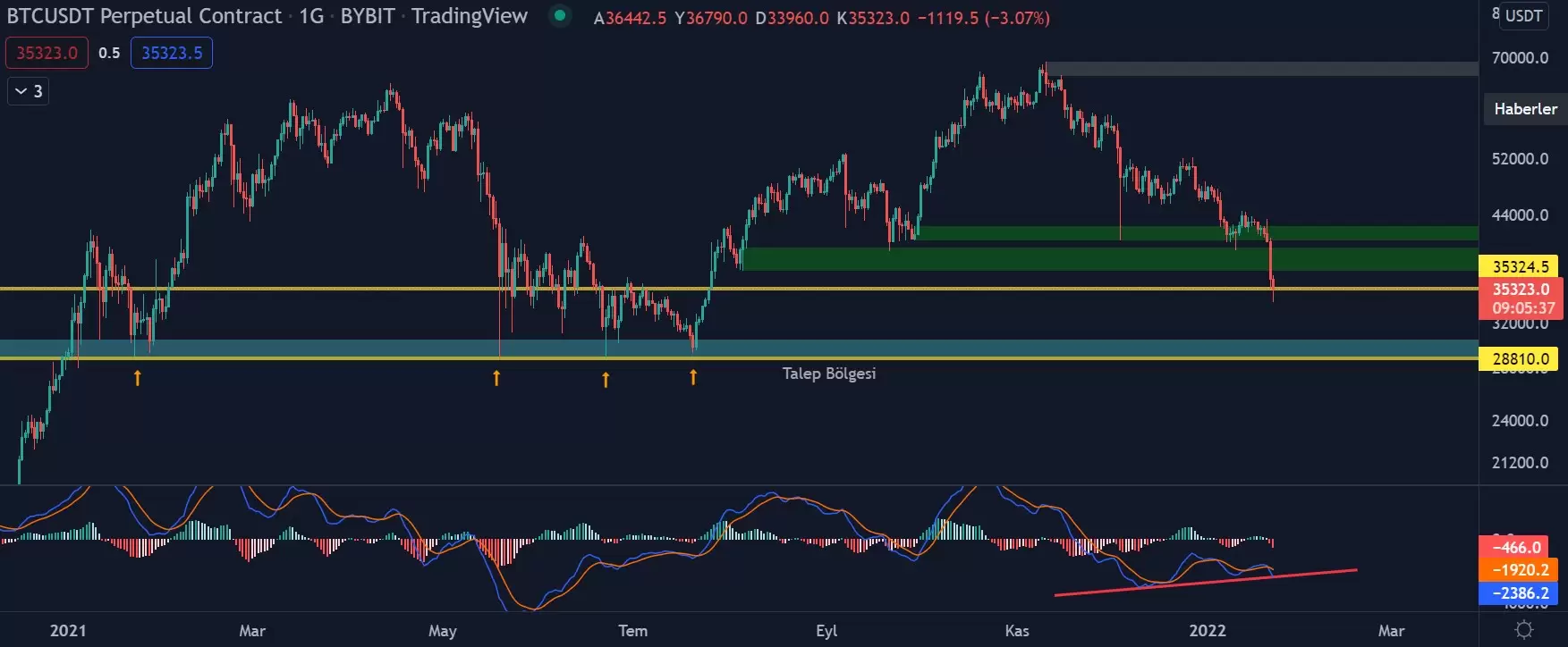 Fakat şu anki fiyata baktığımızda 37.000 dolar desteğinin kırılması ile beraber önemli direnç ve desteğin arasında kalmış olması dönüş sinyallerini zayıf bırakıyor.