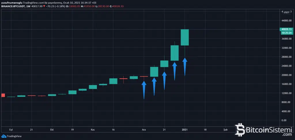 Bitcoin’de haftalık grafiğe baktığımız zaman, her haftaki dip seviyenin bir önceki haftanın dip seviyesinden yüksek olduğu görülüyor. Yani bu da demek oluyor ki büyük resme baktığımız zaman hala yükseliş trendi devam ediyor.