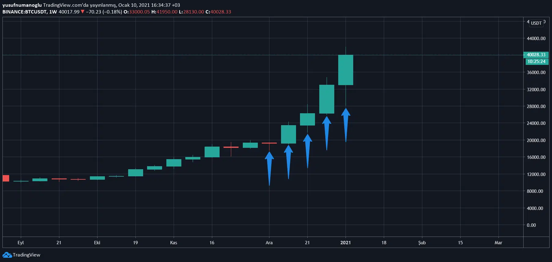 Bitcoin’de haftalık grafiğe baktığımız zaman, her haftaki dip seviyenin bir önceki haftanın dip seviyesinden yüksek olduğu görülüyor. Yani bu da demek oluyor ki büyük resme baktığımız zaman hala yükseliş trendi devam ediyor.