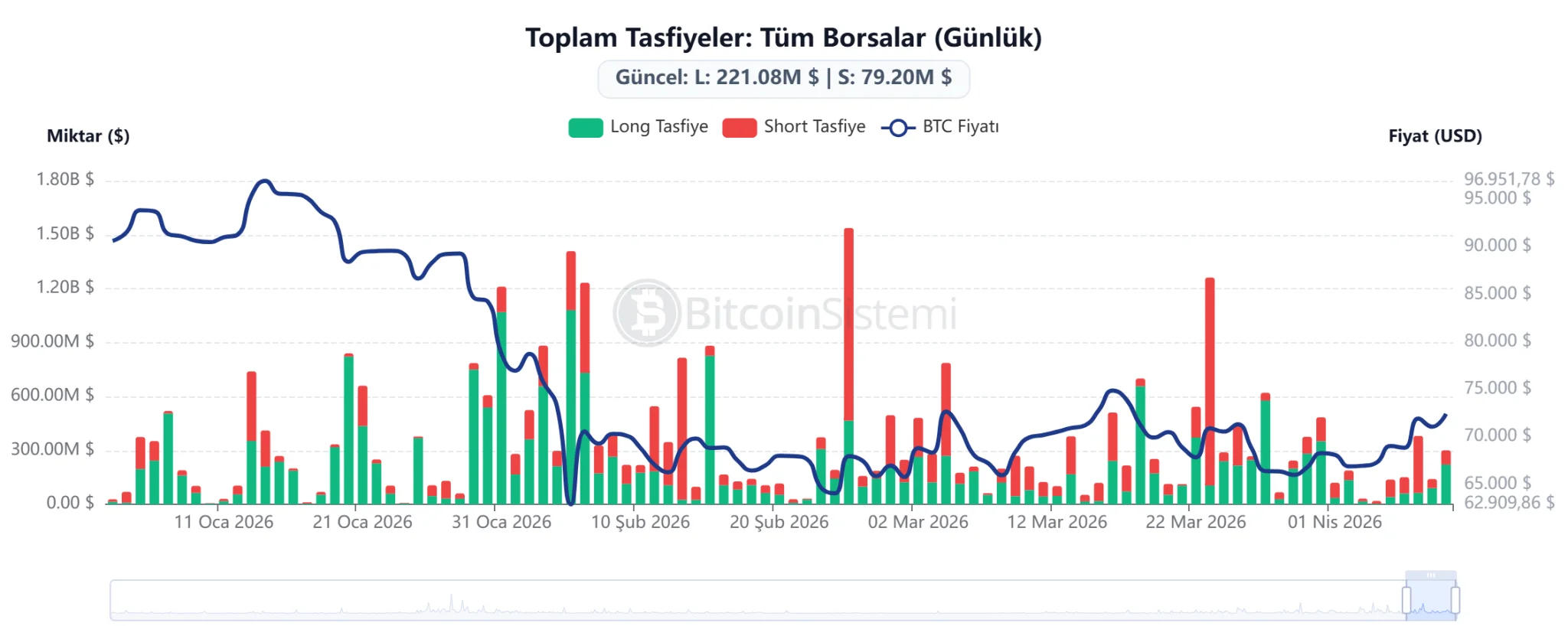 Bitcoin fiyatı ile yaşanan likidasyonları karşılaştıran grafik.