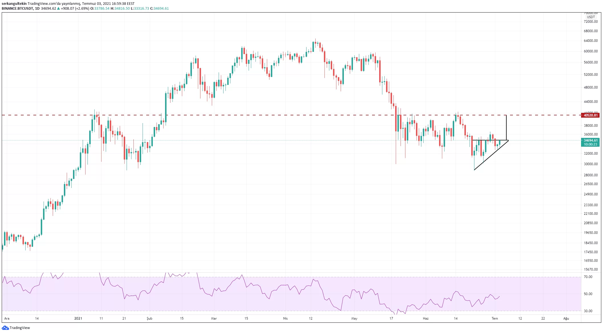 Üçgenin aşağı kırılımı durumunda 33400$, 32630$, 31.000$, 30300$ ve 28800$ sıralı desteklerimiz olacak.