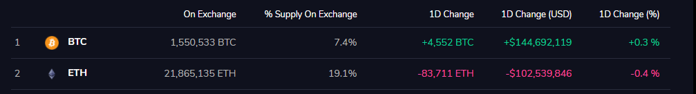 Viewbase verilerine göre, borsalarda mevcut BTC arzı artmaya devam ederken Ethereum arzı azalmaya devam ediyor. 1 günlük değişimlere bakıldığında, borsalara 4552 BTC aktarılmışken, 83771 ETH borsalardan çekildi.