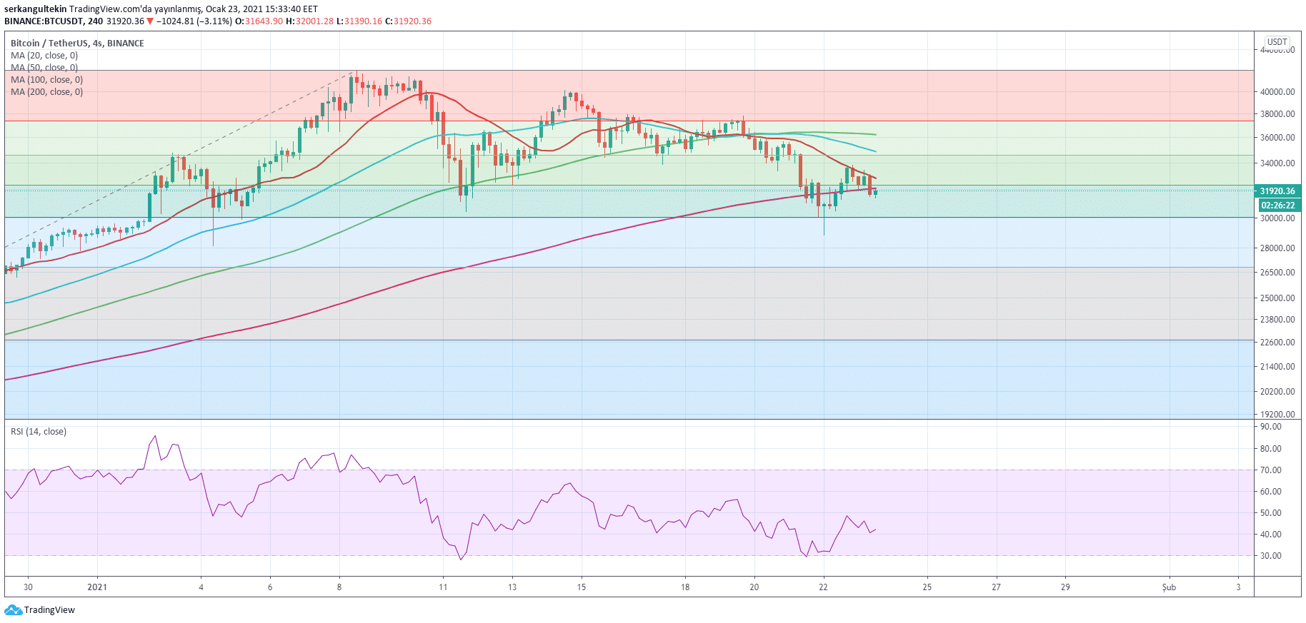 4 saatlik MA 200’ü (32.091$) kıran BTC kritik bir noktada bekleyişini sürdürüyor. Bu noktada tutunamaması durumunda Fibonacci 0.618 seviyesinin geçtiği 30055$ ve günlük grafikte MA50’nin geçtiği 28.300$ seviyeleri yeniden gündeme gelebilir. Bitcoin’de kısa vadeli rahatlama için buradan 4 saatlik MA200 (32090$) ve MA20’yi (32824$) kırmasını beklemek gerekli.
