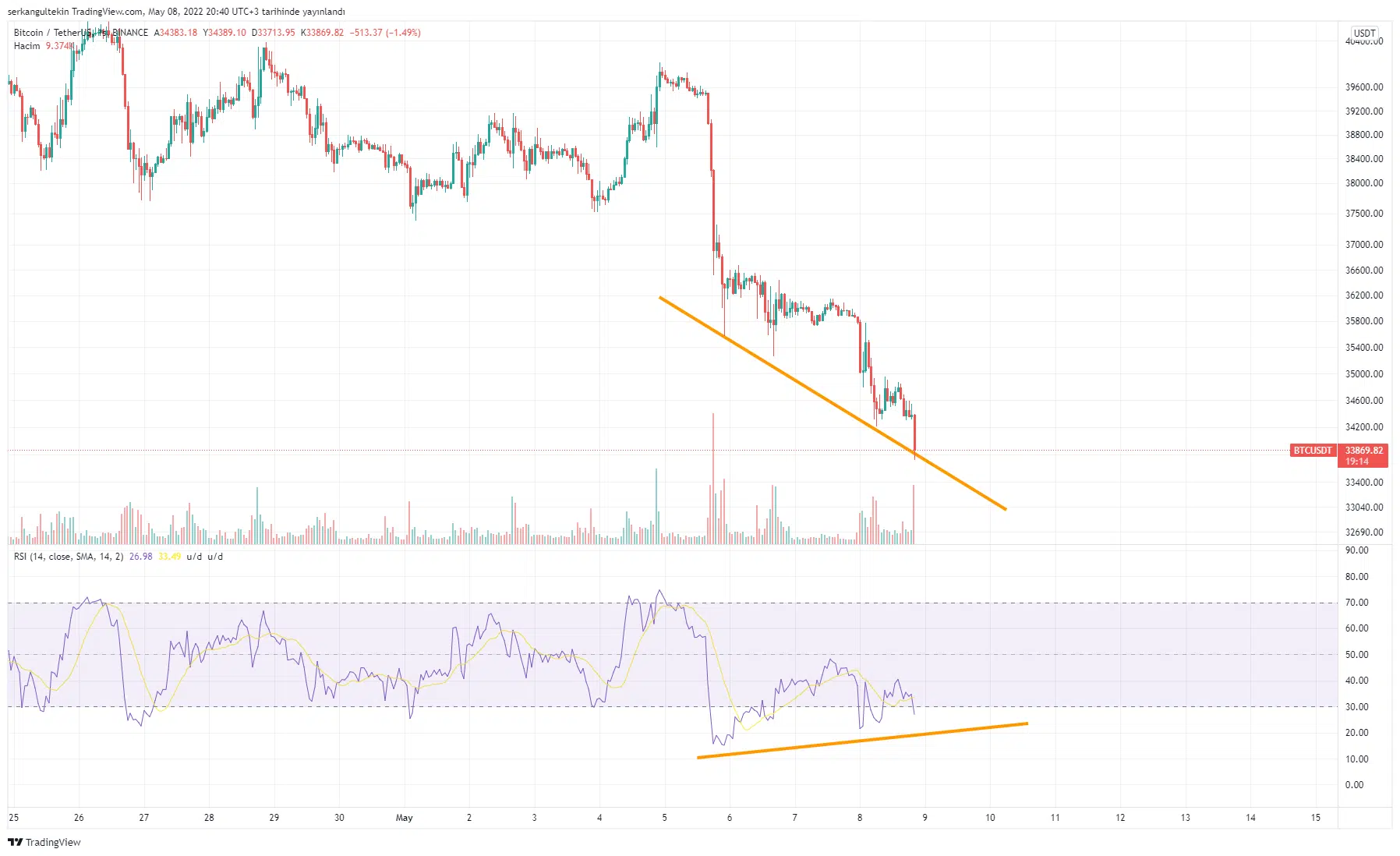 Bu veriler kısa vadede bir tepki gelebileceğinin sinyalini veriyor. Beklediğimiz tepkinin gelmesi durumunda haftalık kapanış öncesi ve sonrasında 36200$ (haftalık ma100) seviyesini takip edeceğiz. Zira şu sıralar fiyat 100 haftalık ortalamanın altına inmiş durumda.