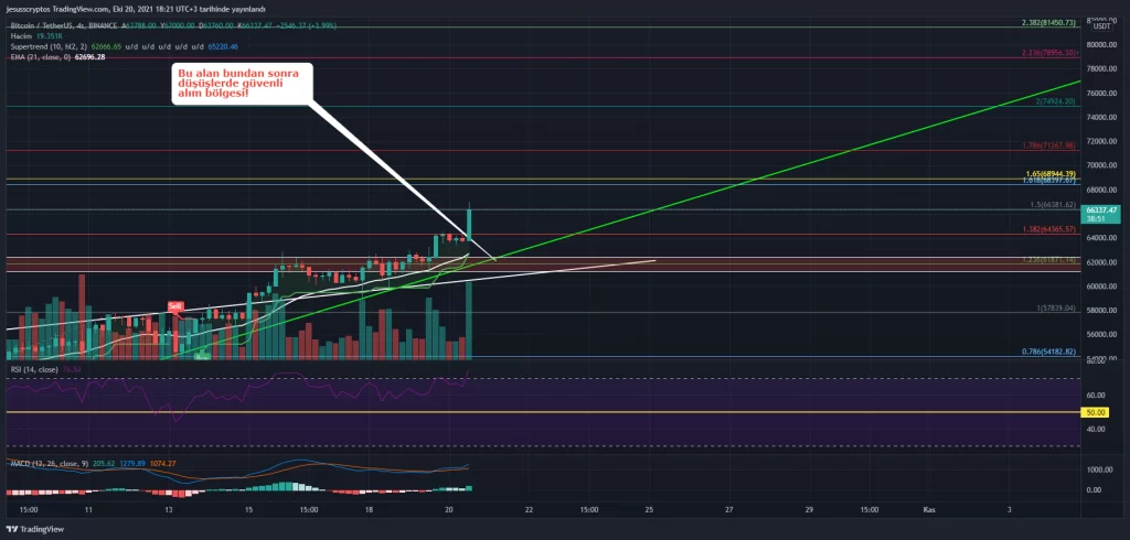 4 Saatlik grafik özelinde 62.400 dolar üzerindeki mum kapanışıyla bir sonraki direnç olan 64.365 dolara ilerleyen BTC, beş mumun sonunda bu direnci kırarak 67.000 doları gördü. Sıradaki direnç seviyesi olan 66.381 dolar üzerinde kalmayı sürdüren BTC’nin sıradaki mum kapanışlarının bu seviye üzerinde olması yükselişin kesintisiz devam etmesini sağlayabilir.