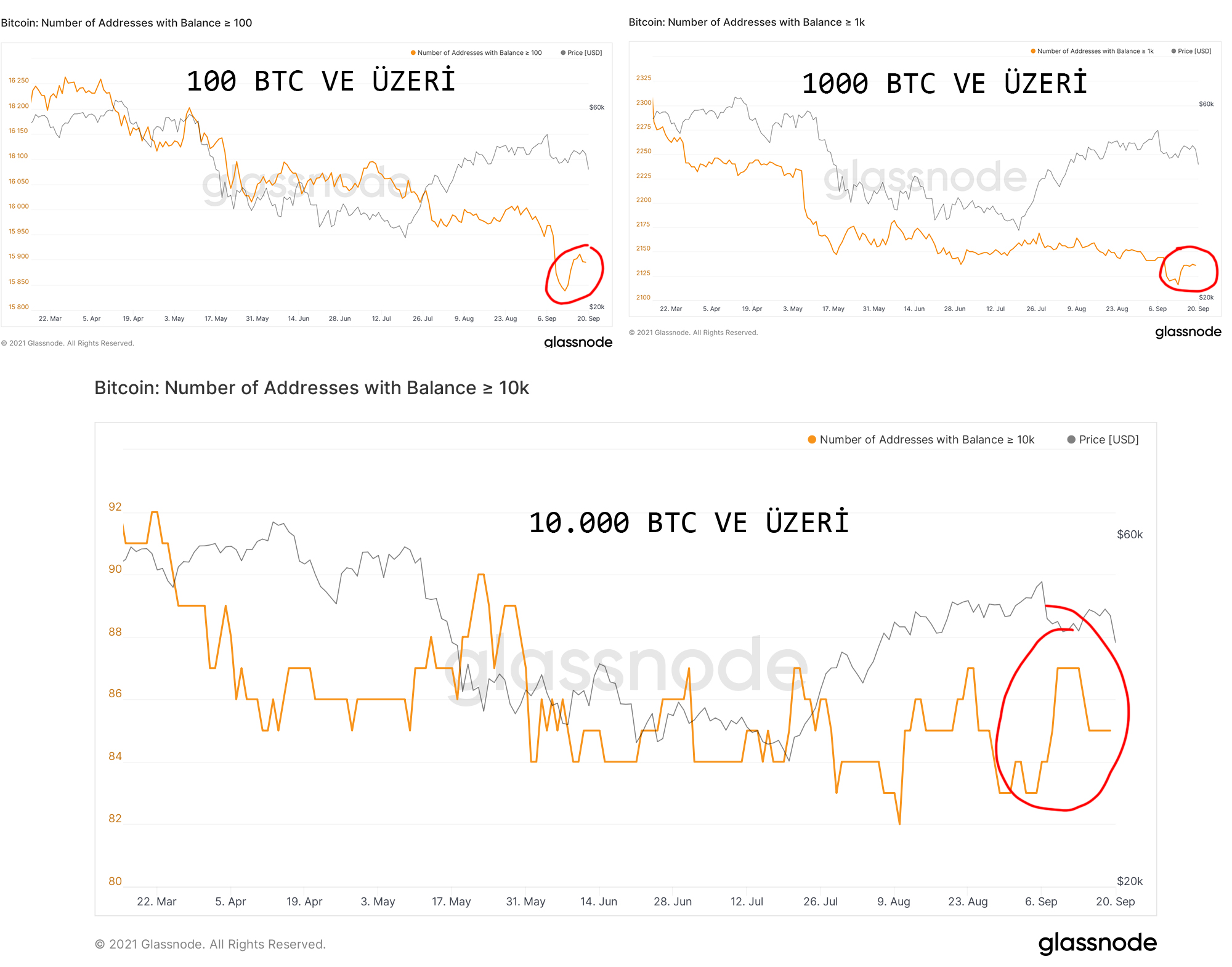 100, 1.000 ve 10.000 BTC üzerinde elinde varlık tutan büyük yatırımcıların hareketleri incelendiğinde de BTC için olumlu sonuçlar ortaya çıkıyor. Özellikle elinde büyük miktarda BTC tutan yatırımcıların 46.000 dolar ortalama ile alış yaptığı aşağıdaki grafiklerden görülüyor.