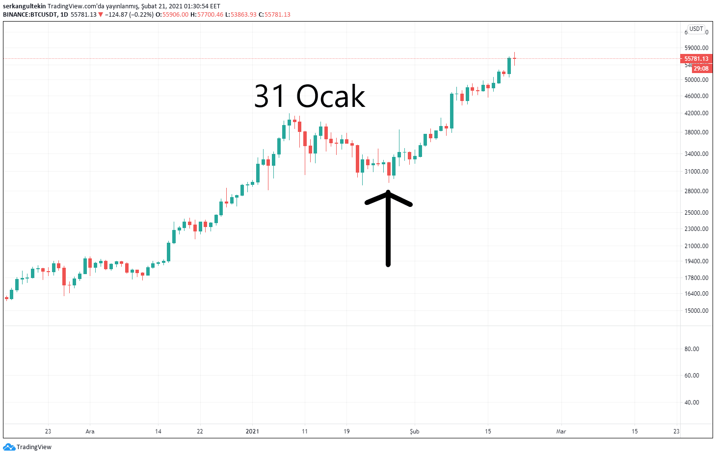 Tepki alımlarıyla birlikte fiyatın yeniden 55700$ seviyelerine çıktığını ve uzun bir fitil oluştuğunu gözlemledik.