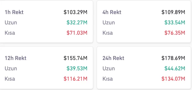 100 milyon dolarlık tasfiyenin 70 milyon doları short pozisyonlarda, 30 milyon doları ise long pozisyonlarda gerçekleşti.