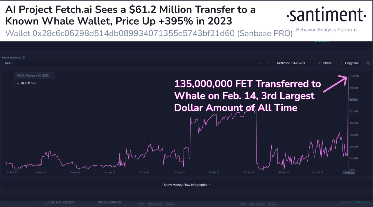 Yapay zeka odaklı kripto para projesi olan FET’e de bakan analistler 14 Şubat’ta gerçekleşen büyük bir işleme dikkat çekti. Buna göre 14 Şubat’ta 125 milyon FET (61 milyon dolar değerinde) aynı zamanda 224 milyon Ethereum tutan bir balina adresine taşındı. Bu hareket FET’in son 567 günde gördüğü en büyük hareketti.