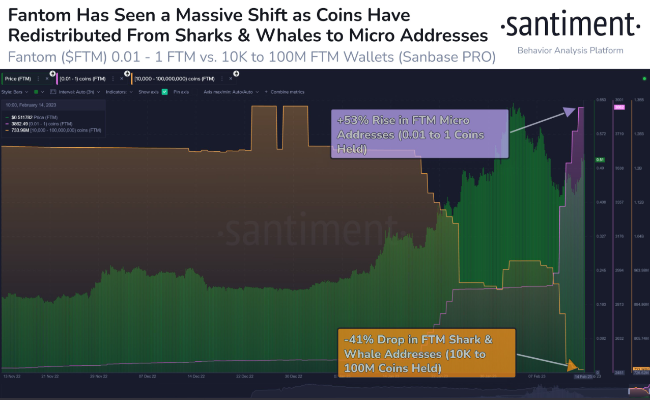 “Fantom köpek balığı ve balina adres sayısı 2023’teki artış sırasında büyük ölçüde düştü. 10 bin ile 100 milyon FTM tutan adresler son 4 haftada 259,7 milyon dolar değerinde kripto parayı boşalttı. Bu tokenler büyük ölçüde 0,01 ile 1 FTM tutan mikro adresler tarafından toplandı.