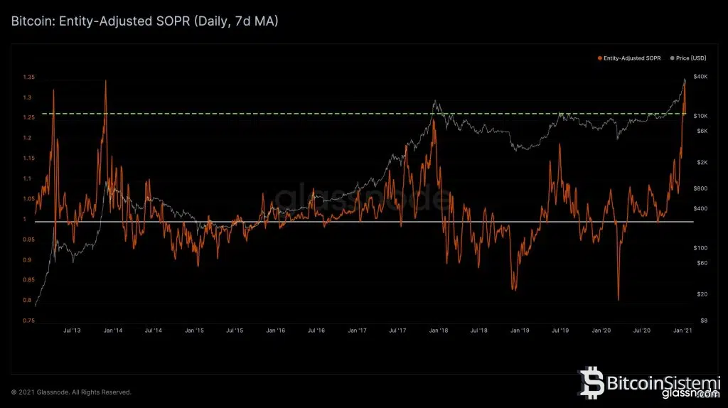 Grafik incelendiğinde SOPR değerinin bu günlerde 1.25’in çok üzerinde olduğu görülecektir. Bu indikatöre göre, geçmiş örneklerde olduğu gibi bir senaryo gerçekleşirse, Bitcoin yükseliş trendini sürdürmeden önce sert bir düzeltme dönemine girebilir.