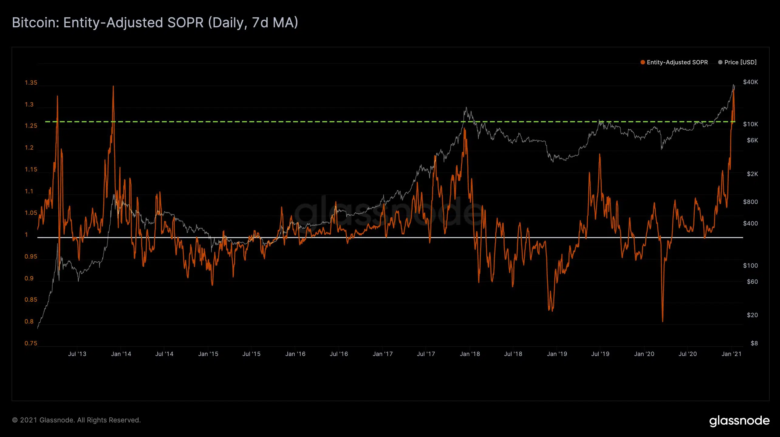Önceki örneklerde SOPR bu seviyelere çıktıktan sonra %80’lik bir düzeltme yaşandı. Mevcut piyasa şartları ve Bitcoin’e olan talep düşünüldüğünde bu denli büyük bir düzeltme beklemek gerçekçi olmayacaktır. Ancak uzun süredir Bitcoin’lerini tutan ve karlılık oranları çok yüksek noktalara ulaşan yatırımcıların karlarının bir kısmını realize etmek istemeleri durumda düzeltme de kaçınılmaz olacaktır.