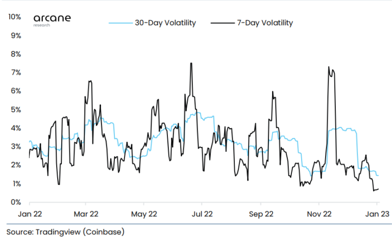 Kripto araştırma şirketi Arcane Research’ın paylaştığı yeni grafiğe göre Bitcoin’in oynaklığı son 2 buçuk senenin en düşük seviyesine geriledi.