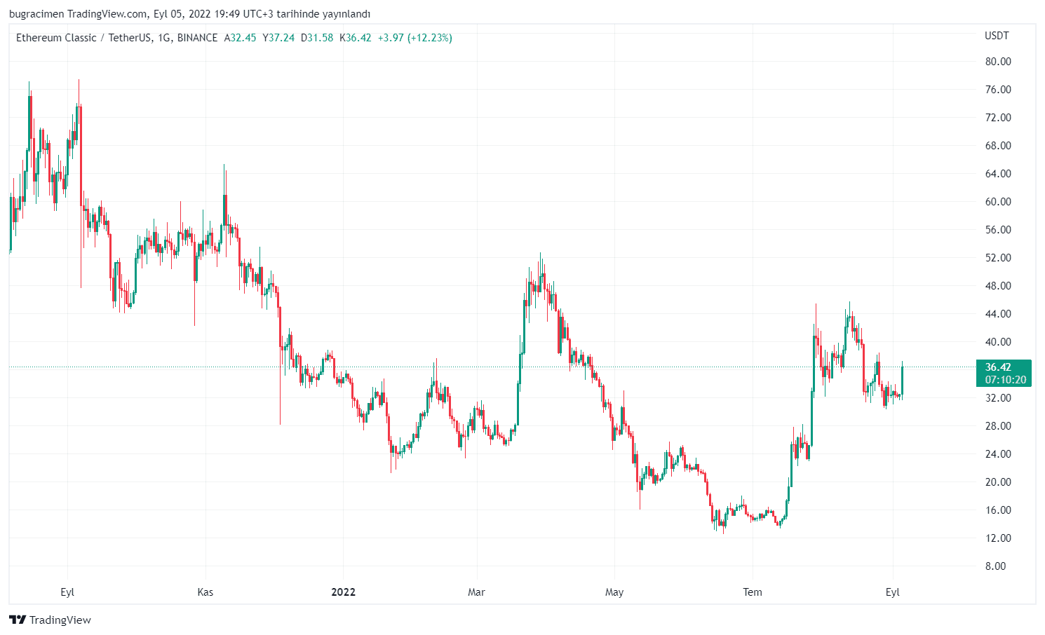 ETC’nin yükselişi sadece bugünden ibaret değil. Temmuz ayının başlarında ortalama 13.50-14$ aralığında işlem gören ETC, bugün itibariyle 36.45 dolara yükselerek %157 değer kazandı.