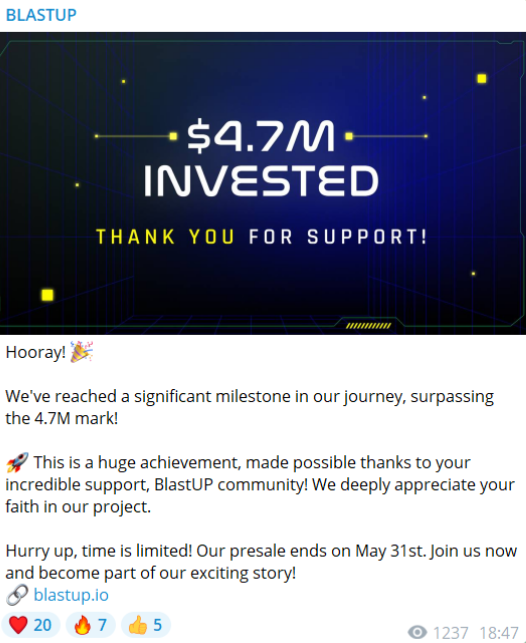 Sadece birkaç hafta içinde 4,7 milyon doların üzerinde toplanan BlastUP token ön satışının devam eden başarısı açıkça görülüyor. Bu etkileyici rakam, projenin önemli potansiyelini fark eden, ilk benimseyenlerin güvenini ve bağlılığını vurguluyor.