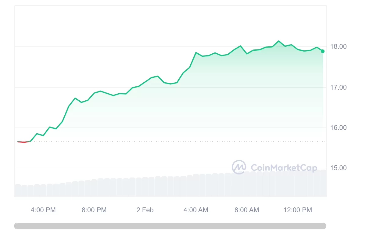 Dünyanın en büyük 13. kripto para birimi, 3 Nisan 2022’den bu yana en yüksek seviyesi olan 18 doların üzerine çıktı.