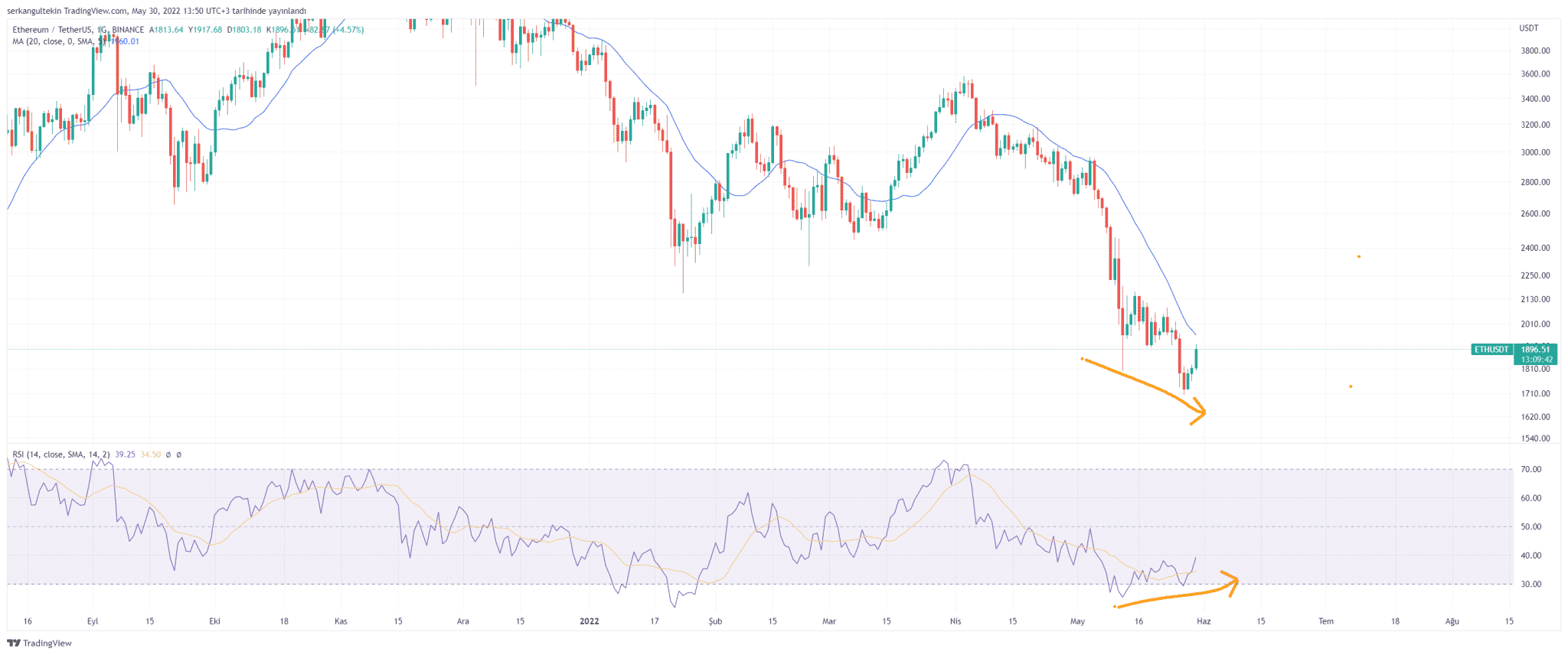 Şu sıralar 20 günlük ortalamasının altında işlem gören Ethereum’da oluşan pozitif uyumsuzluk yükseliş beklentilerini kuvvetlendirirken 1962$ seviyesi üzerinde kapanışlar arayacağız.