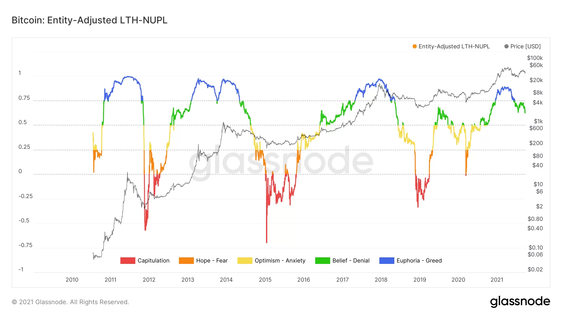 Glassnode tarafından yayınlanan uzun vadeli Bitcoin sahibi olan cüzdanların “Net gerçekleşmemiş kar/zarar” (LTH-NUPL) grafiğine göre Bitcoin’de zirve görüldü ve yeni diplere doğru yol alıyoruz.