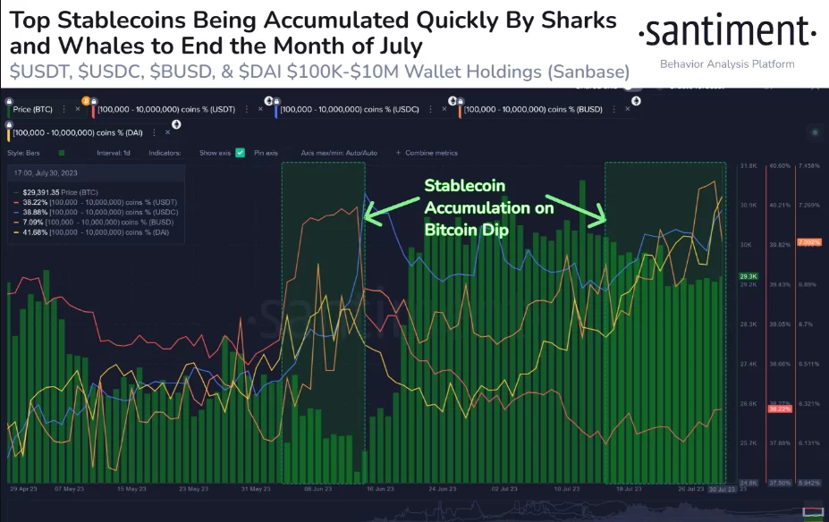 Santiment tarafından hazırlanan verilere göre büyük balina ve köpek balığı cüzdanları Bitcoin’in 30.000$’ın altına inmesiyle Tether, USDC, BUSD ve DAI biriktirmeye başladı.