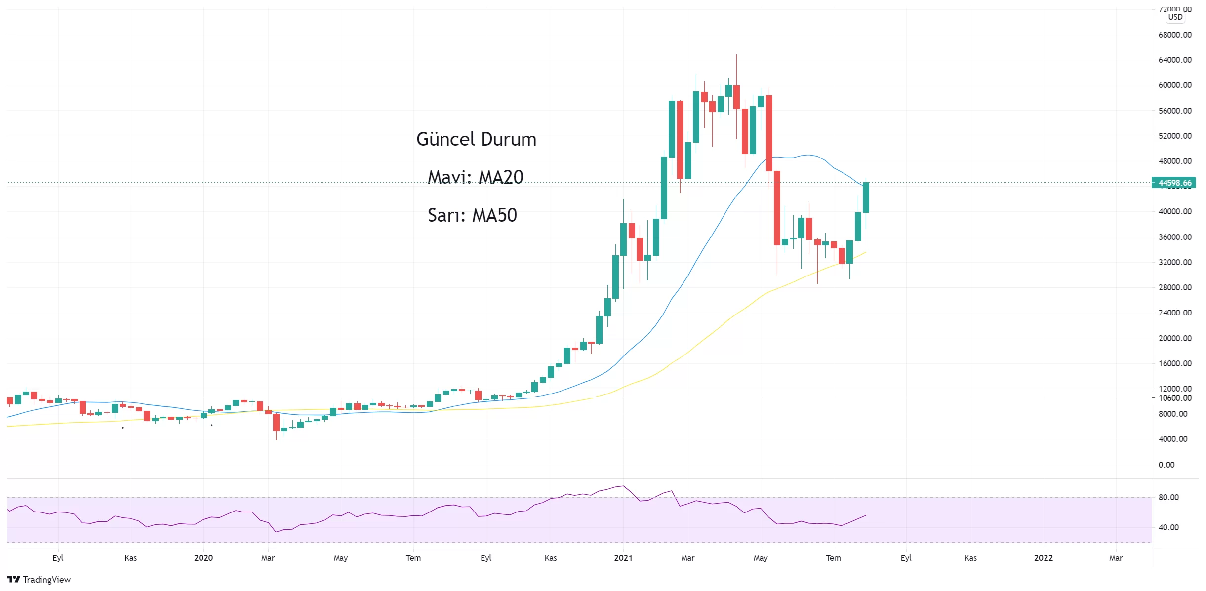 Bitcoin’deki fiyat hareketine baktığımızda bu hafta itibariyle haftalık Ma20’nin (43800$) test edildiğini gözlemliyoruz. Bitcoin haftalık kapanışını bu seviye üzerinde yapar ve yatay hareket ederse, altcoinlerde yukarı yönlü bir hamle görebiliriz. Bu noktada yatırımcıların bir gözü Bitcoin’de olmalı ve Bitcoin haftalık Ma20 altına sarkarsa stop olmayı tercih etmeliler.