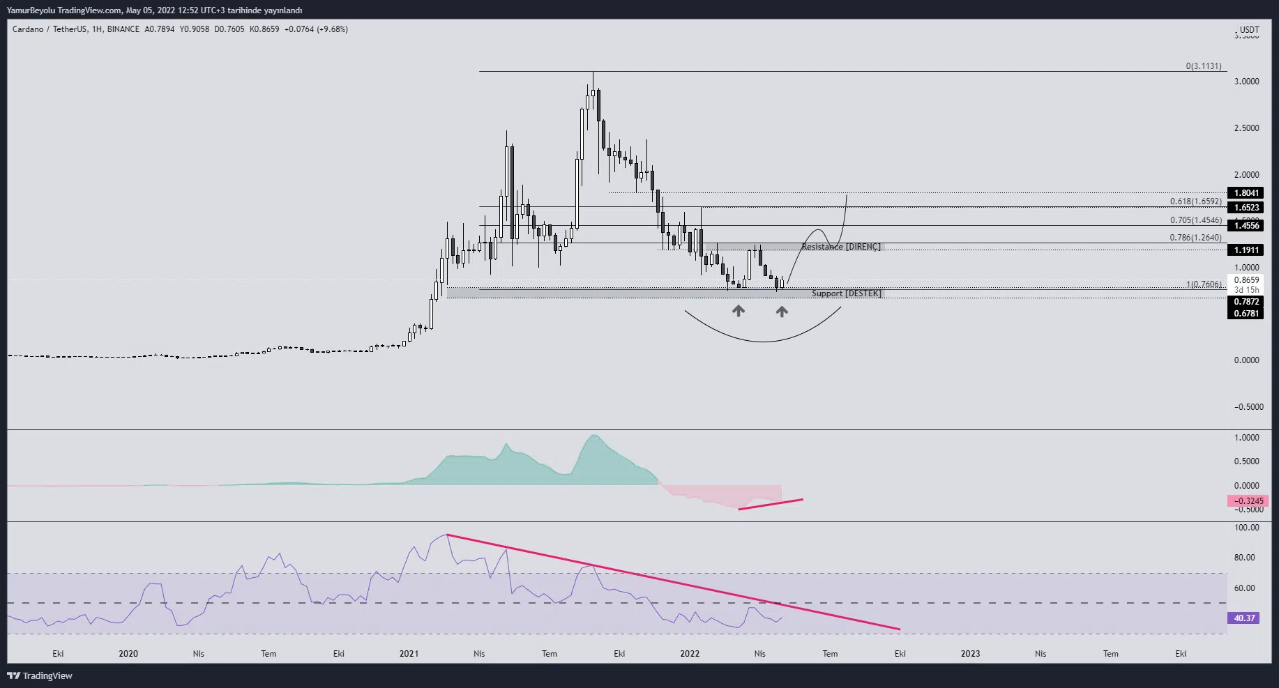 Bunun yanında Cardano’nun teknik olarak haftalık verilerine baktığımızda ise; en son düşüş ile yapmış olduğu düzeltme sonrası gelen ikili dip oluşumu ve RSI tarafının aşırı satış bölgesi alanında bulunması göze çarptı.
