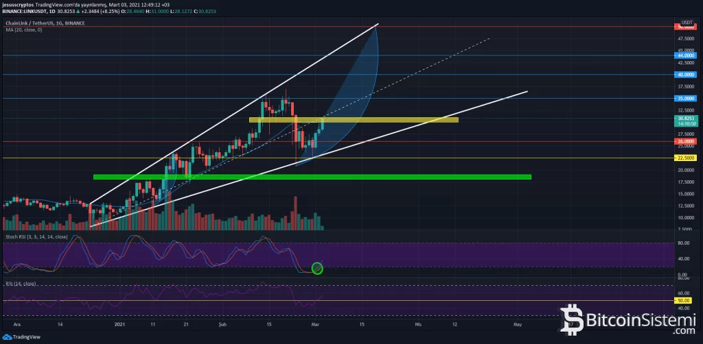 Kripto piyasasında Bitcoin’in kendini 50000 dolar üzerine atması ile Chainlink de güne %10’luk bir yükselişle başladı. Yayın saati itibariyle 30 dolar üzerinden alıcı bulan LINK, önemli bir direnç alanı ile savaşıyor.