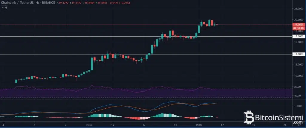 1 Temmuz 2020’den bugüne kadar yaklaşık %420 oranında değer kazanan Chainlink, 20 dolarlık sınırı zorlamaya devam ediyor.