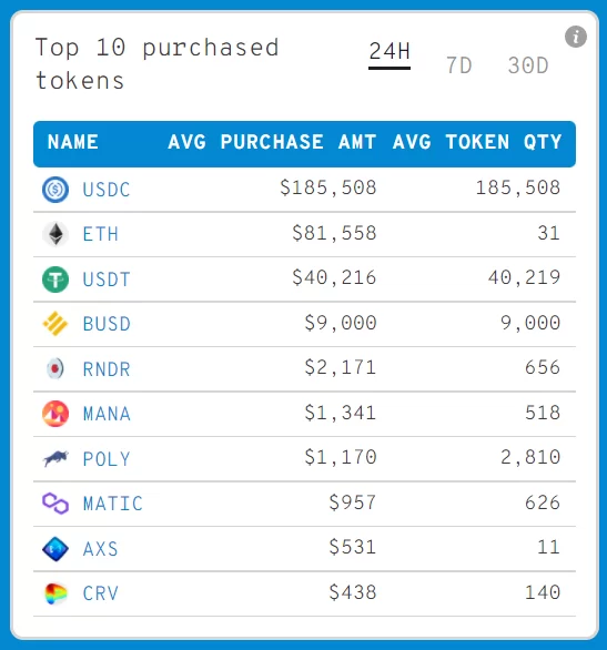 Zira en iyi 1000 Ethereum balinasını izleyen Whalestats’ın verilerine göre RNDR en iyi Ethereum balinalarının en çok satın aldığı tokenler arasında 5. sıraya yükseldi.