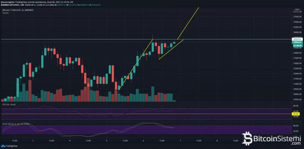 Günlük grafikte görülen güçlü ayı uyuşmazlığına rağmen 4 saatlikte düşünülen yükselen üçgen formasyonu 2 saatlik grafikte hayat buluyor. Bu grafikte 35.325 dolar üzerinde mum kapanışı gelmesi durumunda fiyatın boğa filaması hedefi olan 40.000 dolara doğru yükseldiğini görebiliriz. Ancak günlük grafiği ve temel analizi düşündüğümüzde burada yeterli hacmin oluşmamasına ve fiyatın düşüşüne şahit olabiliriz. Bu düşüş durumundaysa önceki grafiklerdeki destek seviyeleri geçerlidir.