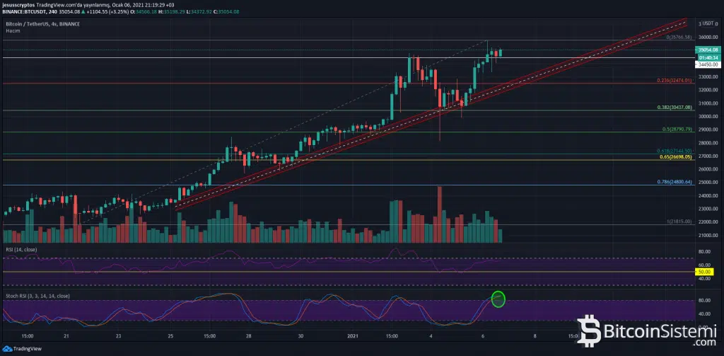 Kripto para piyasası 1 milyar dolarlık piyasa hacmine yaklaşırken %68’in üzerindeki hacmiyle Bitcoin (BTC), yayın saati itibariyle 35.500 dolardan alıcı buluyor. Günlük grafikte bugün, 3 Ocak günü yaşanan ATH seviyesinden daha yüksek bir ATH olmuşmuş oldu. Ancak bu yükselen iki tepeye karşın RSI göstergesindeki alçalan tepeler güçlü ayı uyuşmazlığını gösteriyor.