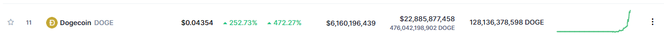 Doge coin’in 24 saatlik hacmi 21 milyar doları geçti. Fiyat artışıyla birlikte market değeri yükselen Doge Coin CoinmarketCap sıralamasında 11. sıraya yükseldi.
