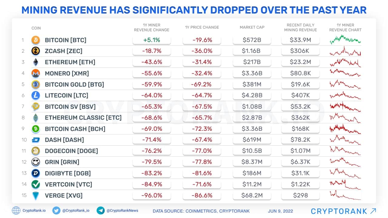 ATH’sinden yaklaşık %77 düşüş yaşayan Dogecoin’in madencilik gelirleri de bir hayli düştü.