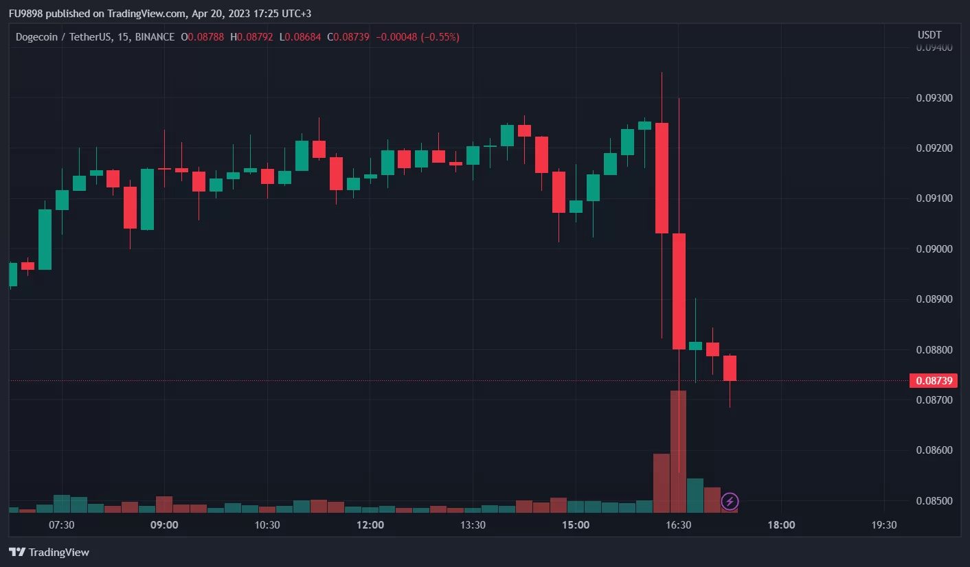 DOGE fiyatında yaşanan düşüşü gösteren 15 dakikalık mum grafiği.
