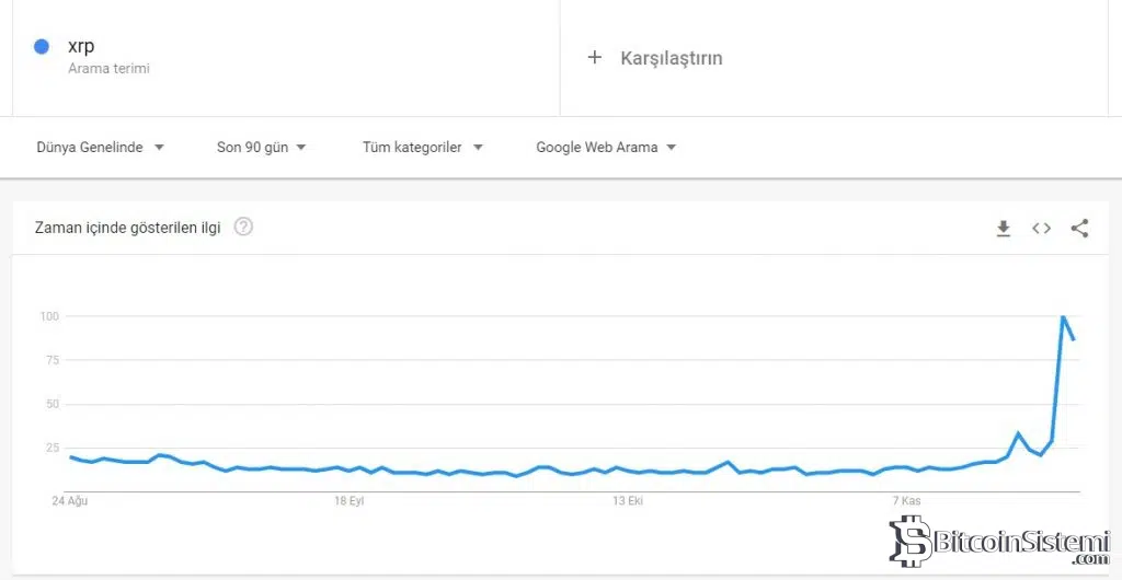 Son zamanlarda Google trendlerinde en göze çarpan coin XRP olarak görülüyor. Bitcoin’deki rallinin başlamasıyla Dünya’nın gözü Kripto paralara yöneldi. Bu ralli de XRP’ye ayrı bir parantez açmak gerekiyor. XRP’nin, Google’ın dünya geneli 90 günlük trend grafiğindeki yükselişi, XRP’ye olan ilginin ne kadar büyük olduğunu gözler önüne seriyor. Son zamanlarda artan işlem hacmi ile yüksek oranda kar getirisi sağlayan XRP, bu ilgi ile birlikte yatırımcısının yüzünü güldürmeye devam edebilir.