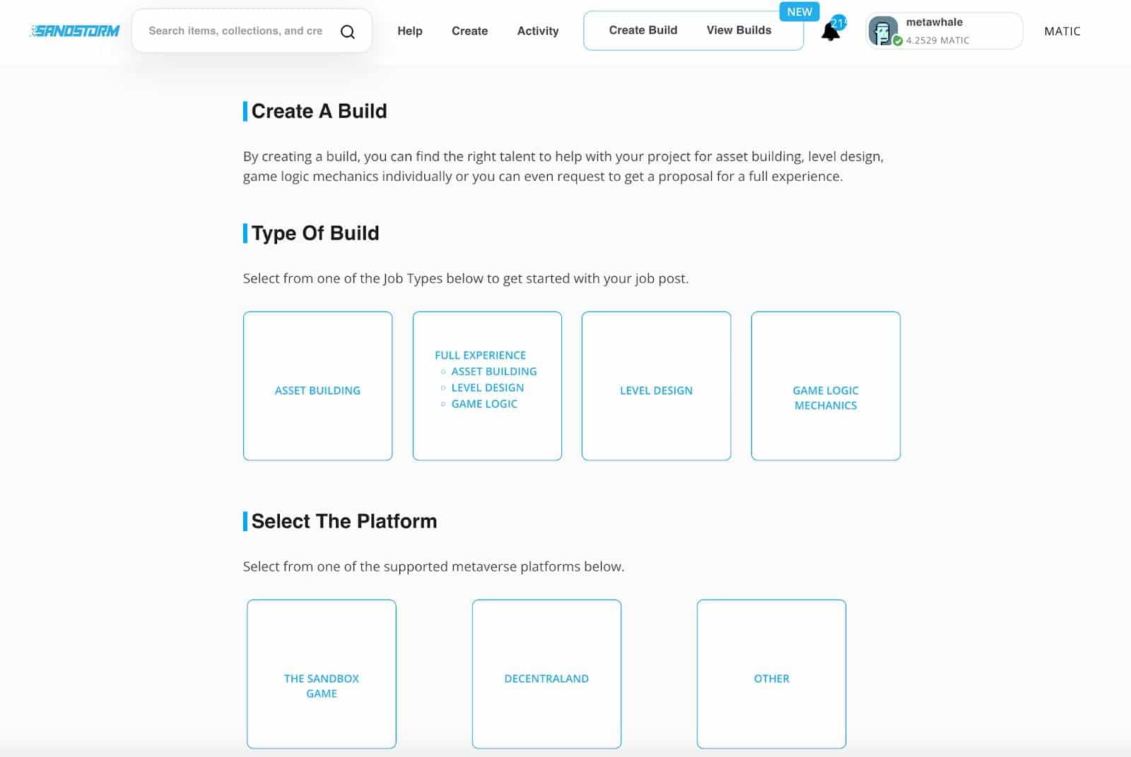 SandStorm platformu, Beceriler, Kullanılabilirlik, İletişim, Kalite, Son Tarihler ve Ekip İşbirliğine dayalı inşaatçıları vurgular. Fiziksel dünyada bir rüya evi inşa etmeye benzetilebilir, ancak yerel bir gayrimenkul geliştirme firması kiralamak yerine, Kore’deki en iyi mimarı, Londra’daki en iyi çatı ustasını ve Kanada’daki en iyi elektrikçiyi seçmek tam da bu platform ile mümkün oluyor. Öte yandan sanal dünyada faaliyet gösteren markalar, müteahhitleri önceki iş portföylerine göre seçebilirler.