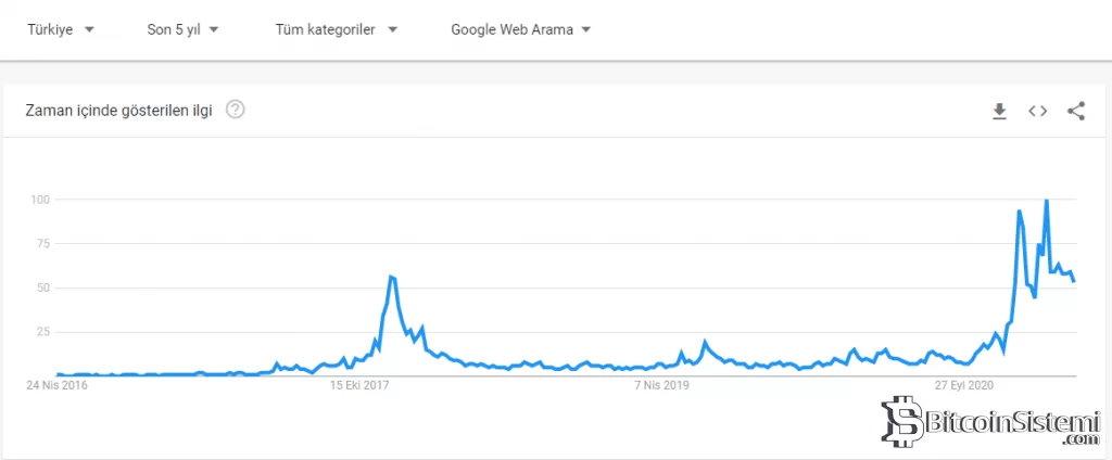 Türkiye’deki Bitcoin aramalarına ilişkin grafik, yatırımcı ilgisinin 2017 yılından çok daha yüksek seviyede olduğunu gösteriyor.
